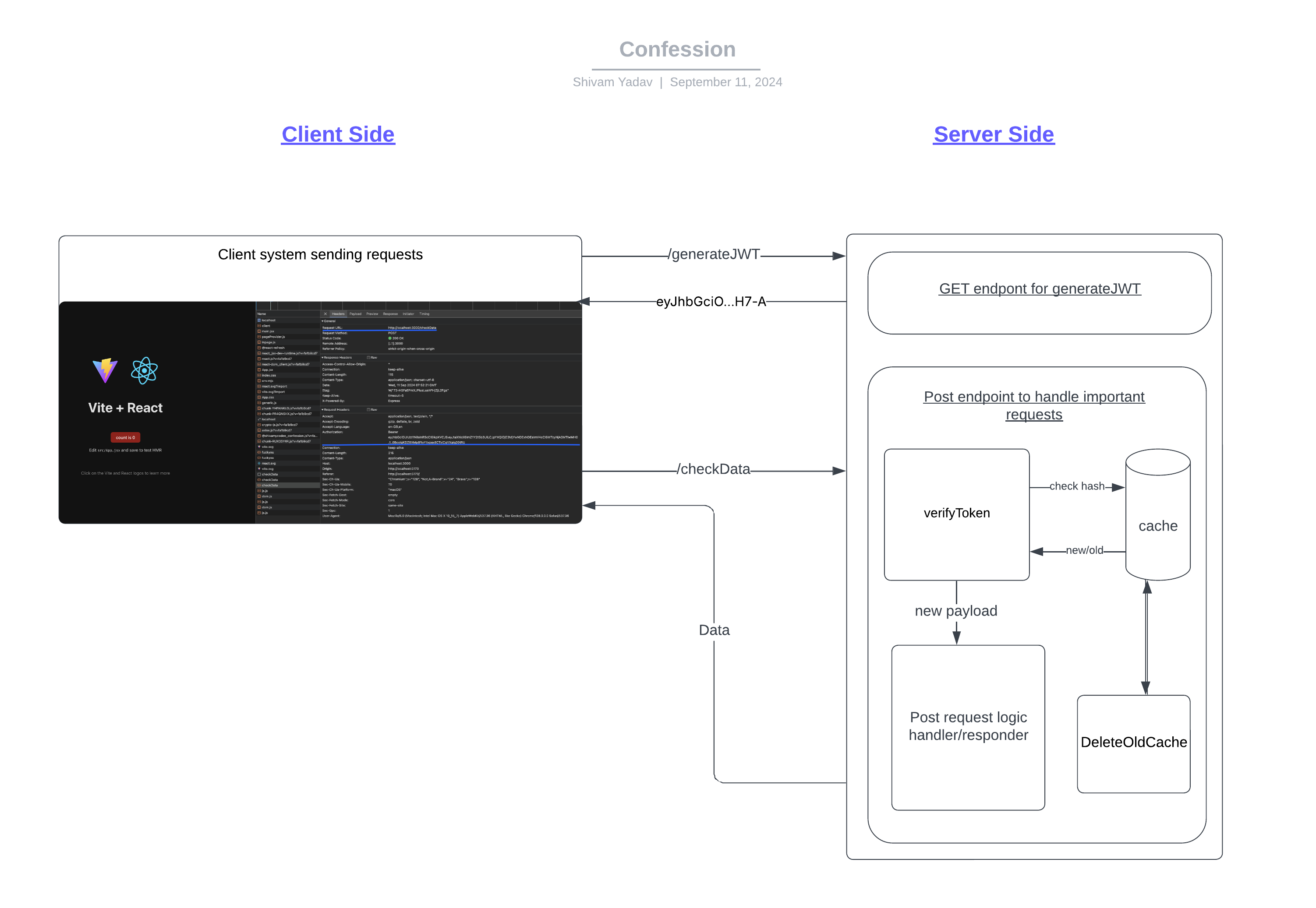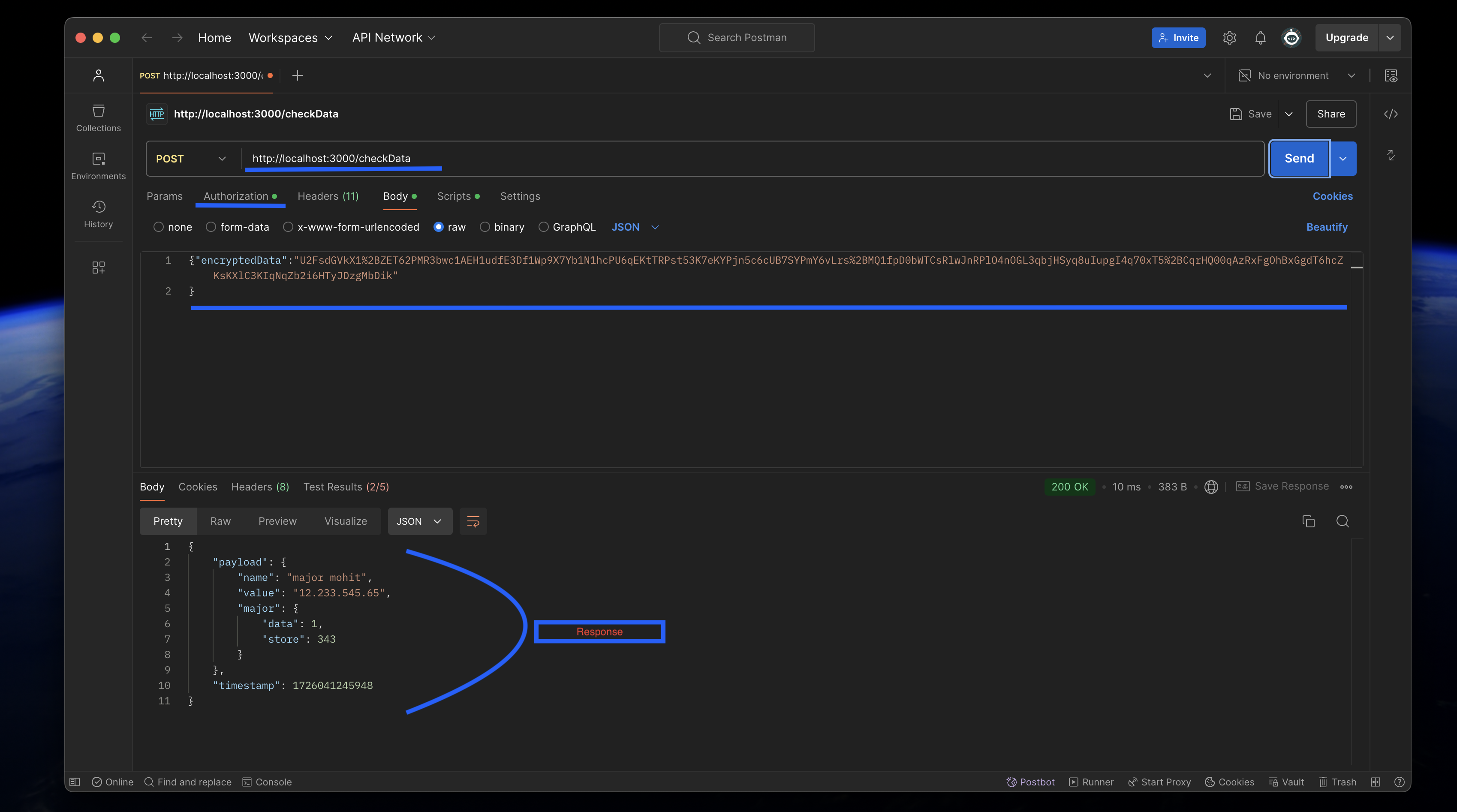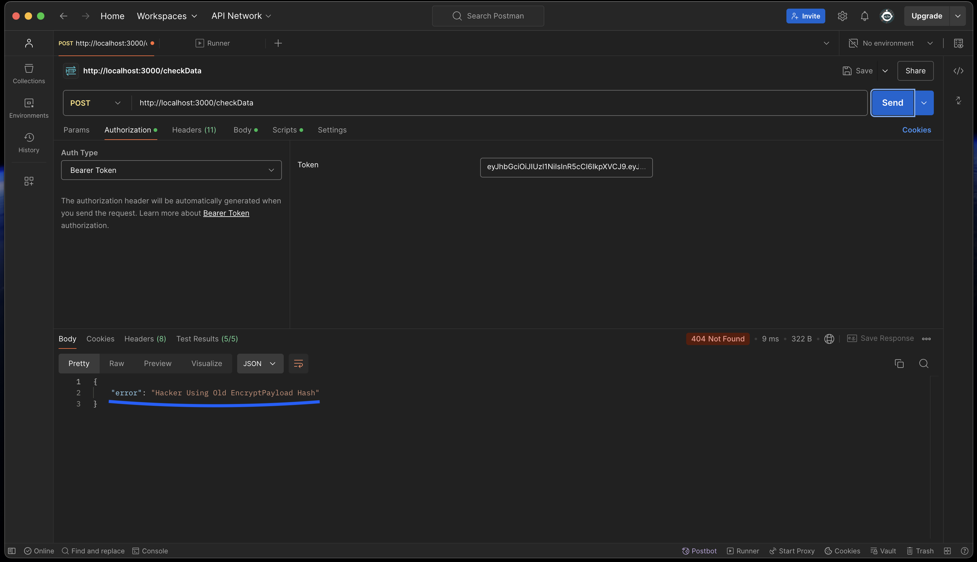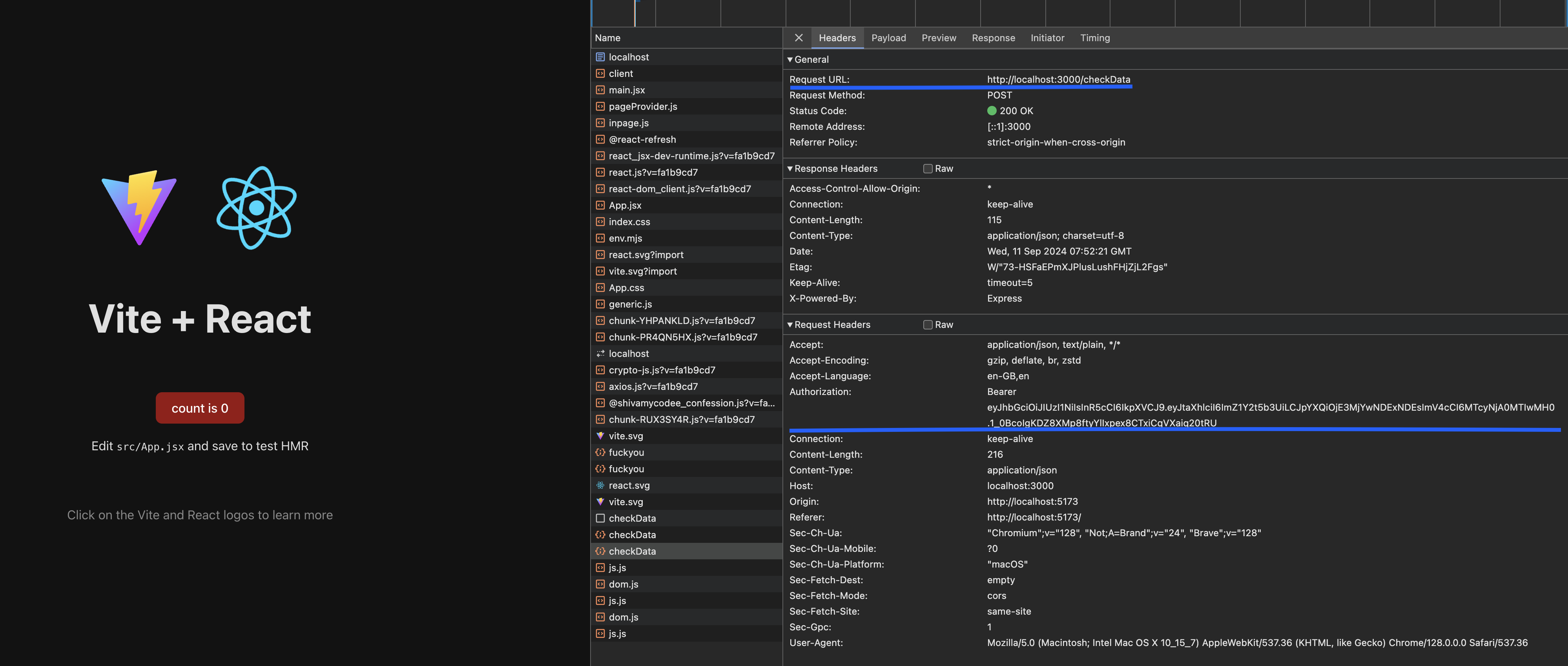 - As you can see in the image below i'm running my webiste, which is sending a post request to the server at endpoint checkData, i'm sending a JWT Bearer token and encrypted payload with my request.