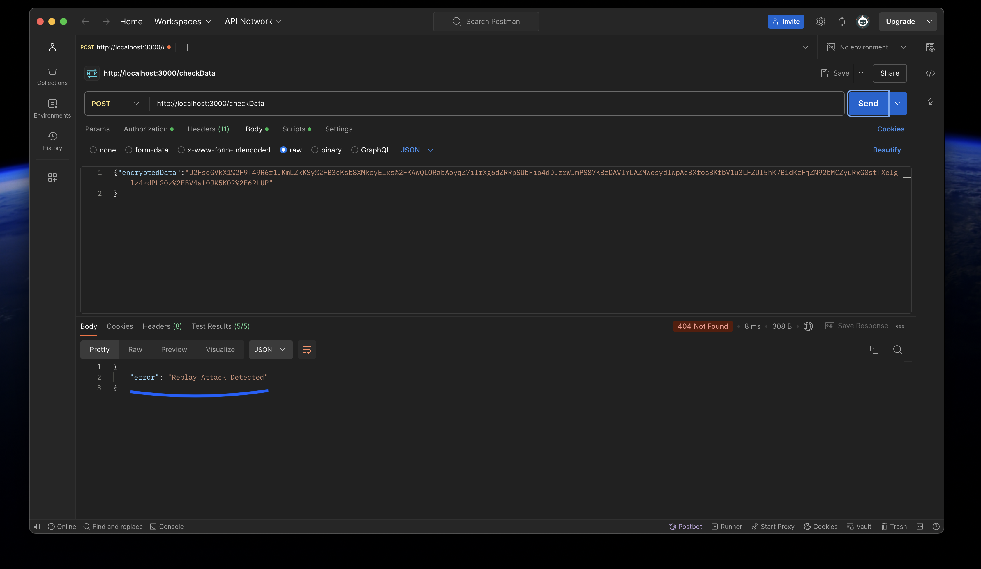 - When hacker tries to do a replay attack using a valid JWT and encrypted payload, this would be the response from my package: